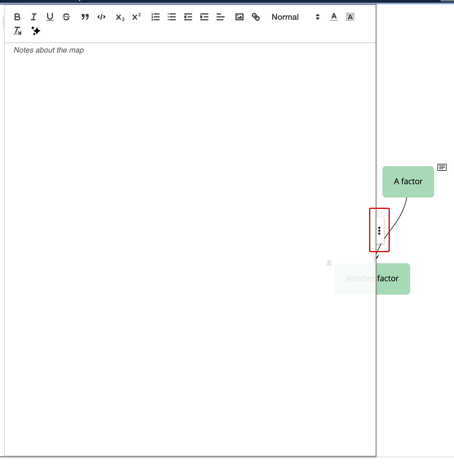 at the top right of the panel will open a new window that also shows the notes for the factor or link. Using this window is easier if you have more than a few words to write. It also provides a more extensive range of editing buttons: you can style the text, insert images into the text, change the font and so on. The small panel version of the notes keeps in sync with the larger window, and the text is saved as you write. When you are finished, click on the map background to deselect the factor or link; this also closes the Note Window.