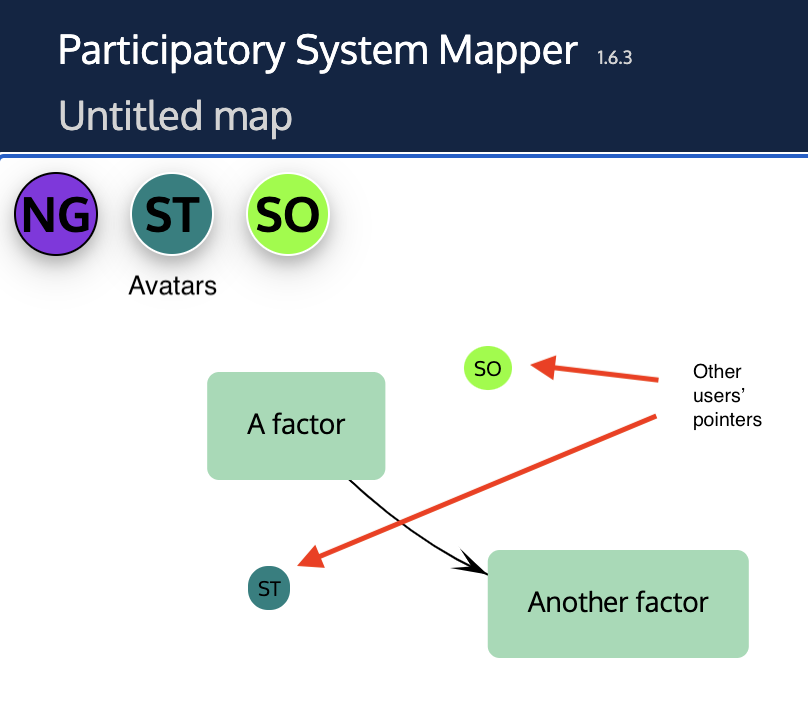 The other users' mouse pointers are shown on the map. As you move your mouse pointer (or finger on a touchscreen), a small disc containing your initials moves on every other users' map correspondingly. If you are talking with other users by audio or video link, you can use your mouse to point to things of interest, and the other users can see what you are pointing at.